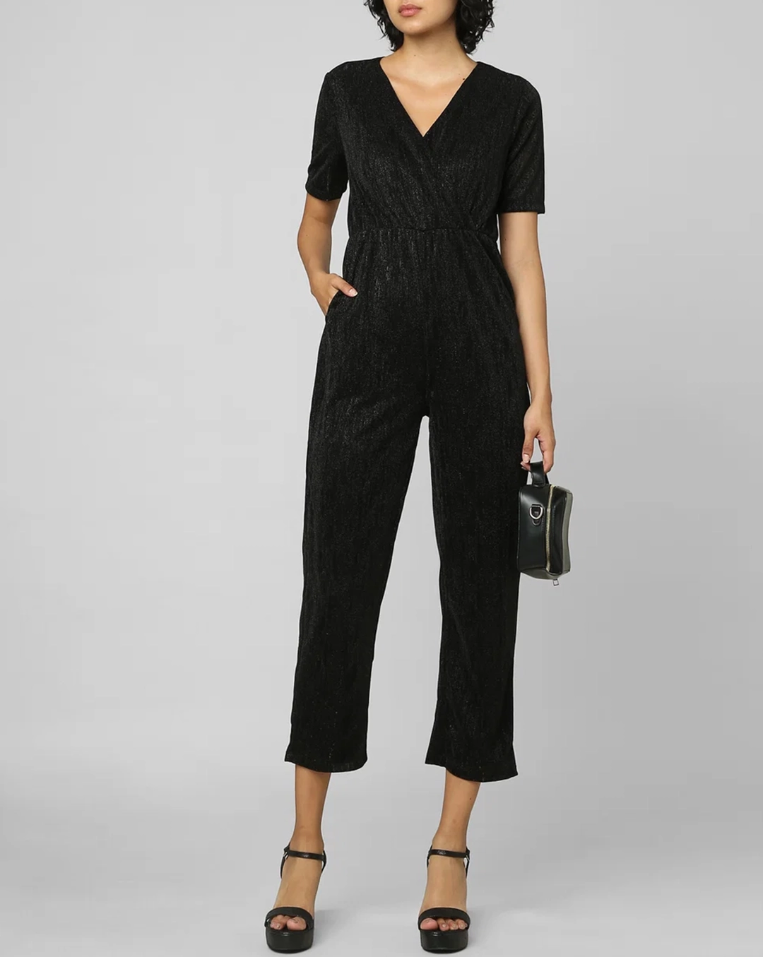 Black Wrapover Shimmer Jumpsuit